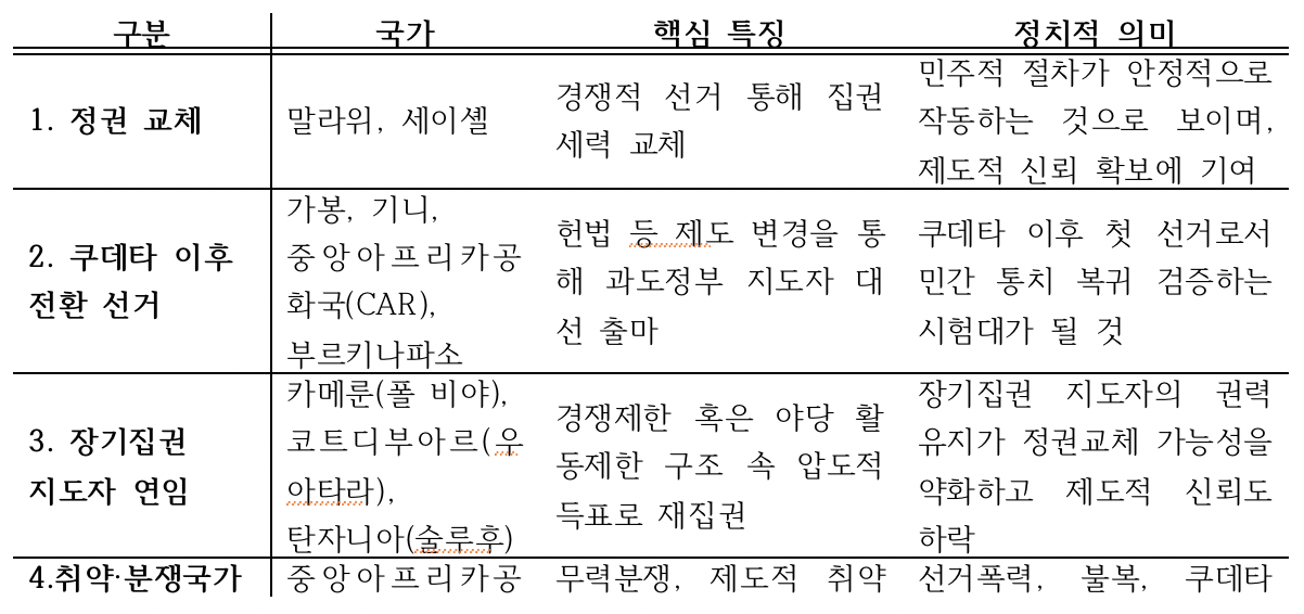 2025년 아프리카 선거의 두드러진 특징은 다음과 같이 네 가지로 정리할 수 있다. 첫째, 쿠데타 이후 민정 이양을 위한 선거가 대거 집중되어 있다. 가봉, 기니, 중앙아프리카공화국(CAR), 부르키나파소에서 과도정부가 주도하는 선거가 예정되어 있거나 이미 실시되었다. 이들 선거는 단순히 선거 일정을 재개하는 수준이 아니라 헌법과 제도 전반을 개정하는 정치적 변경을 수반하는 경우가 많았다. 특히 과도정부 지도자들이 스스로 대선 후보로 나서도록 허용하는 헌법 개정은 군부의 정권 유지 정당화 수단인지, 진정한 민주주의로의 이행인지 판단하기 어렵게 한다. 동시에 나타난 이러한 흐름은 서·중부 아프리카의 정치적 트렌드로 보여지며, 민간 통치로의 정상적 복귀를 검증하는 시험대가 될 것이다. 그러나 쿠데타를 일종의 ‘정권 재설계 수단’으로 정당화할 우려도 있다.